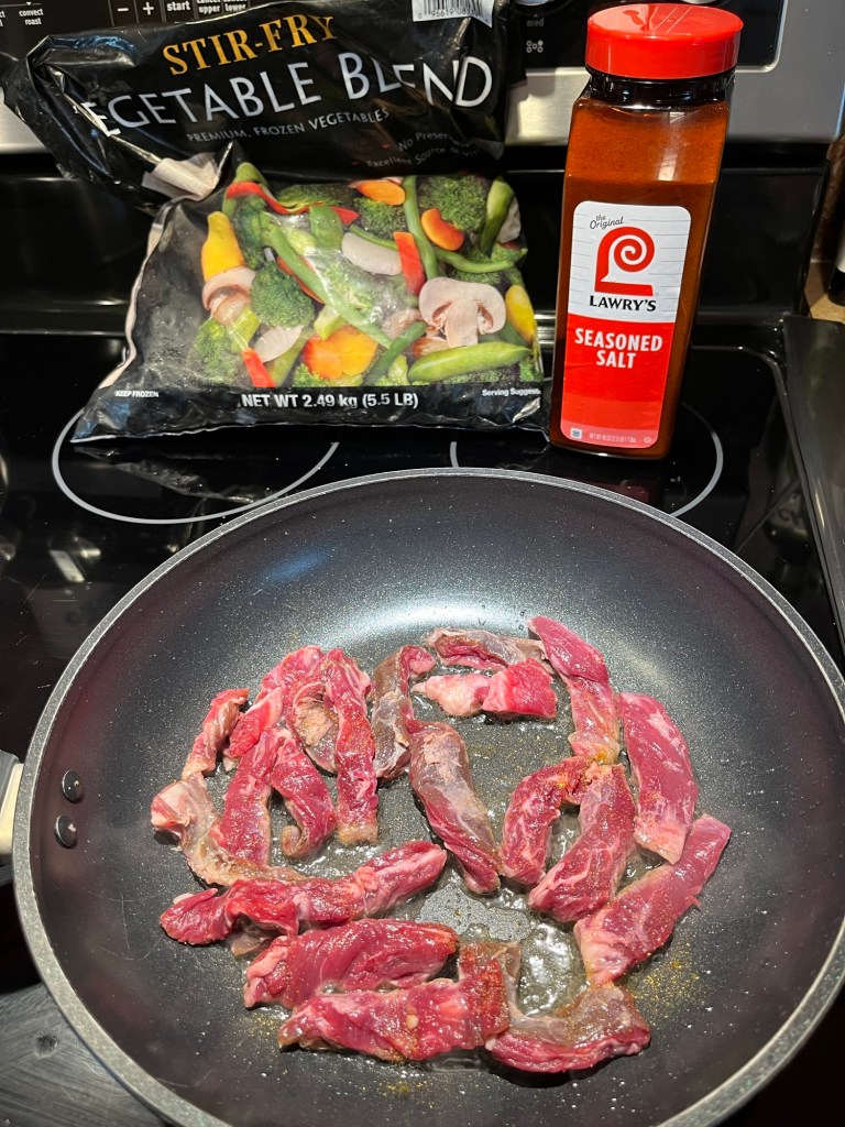 Melt coconut oil in a hot skillet (about 350°F). Add steak and season as desired. Cook on med-high until your preferred doneness. - Stir in the Veggies